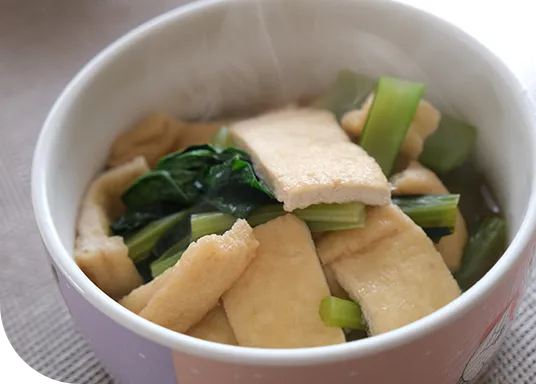 厚揚げを目指して向井食品の油揚げは、「お客様においしく食べていただく」これに尽きると考えています。家庭で愛される「お揚げさん」をお届けして、さまざまな料理に活用してもらえば栄養たっぷりの食生活が実現し、健康づくりのお役に立てます。これからもおいしい油揚げづくりに励んでいきます。
