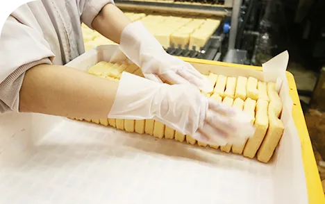 当社では、「おいしさ」と「賞味期限の長さ」を両立する油揚げの製造に取り組んでいます。どちらか一方が欠けてしまうと油揚げの廃棄に繋がりやすいため、製造工程から、包装の材質や保存方法など細部まで改良を重ねて、小売店やご家庭でおいしさを維持しつつ長期間保存できる商品づくりを行っています。